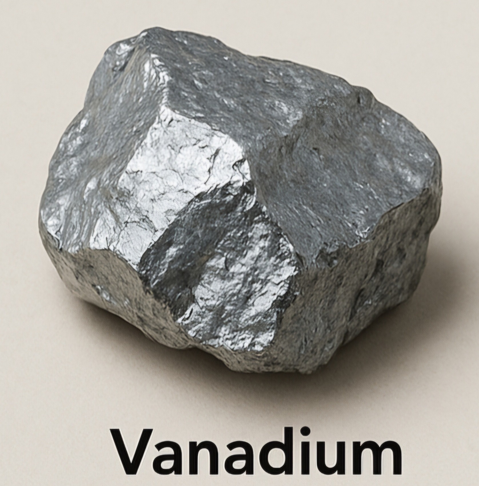 ● 성분,성질: 원소기호 V, 원자번호 23. 단단함 은회색을 띠는 금속.