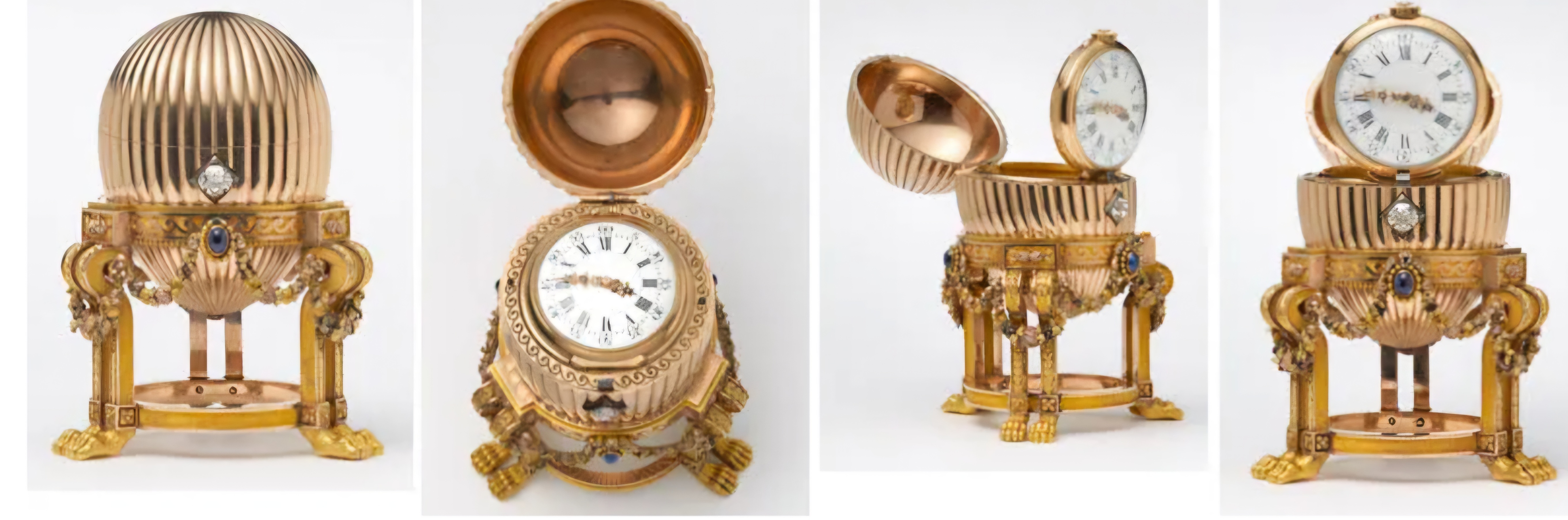 달걀에 붙은 다이아몬드를 꾹 누르면 달걀이 덜컥하고 열린다. 뚜껑이 열리면 백색 에나멜과 14K 황금으로 만든 Vacheron Constantin 사 시계가 나온다.