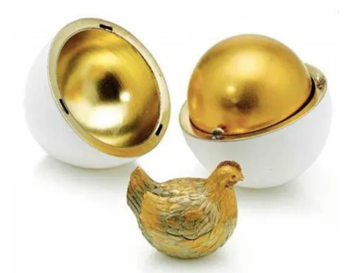 이 달걀을 비틀어서 열면 무광택 마감된 순금 '노른자'가 드러난다. 노른자를 또 비틀어 열면 루비 눈이 달린 황금 암탉이 나온다.