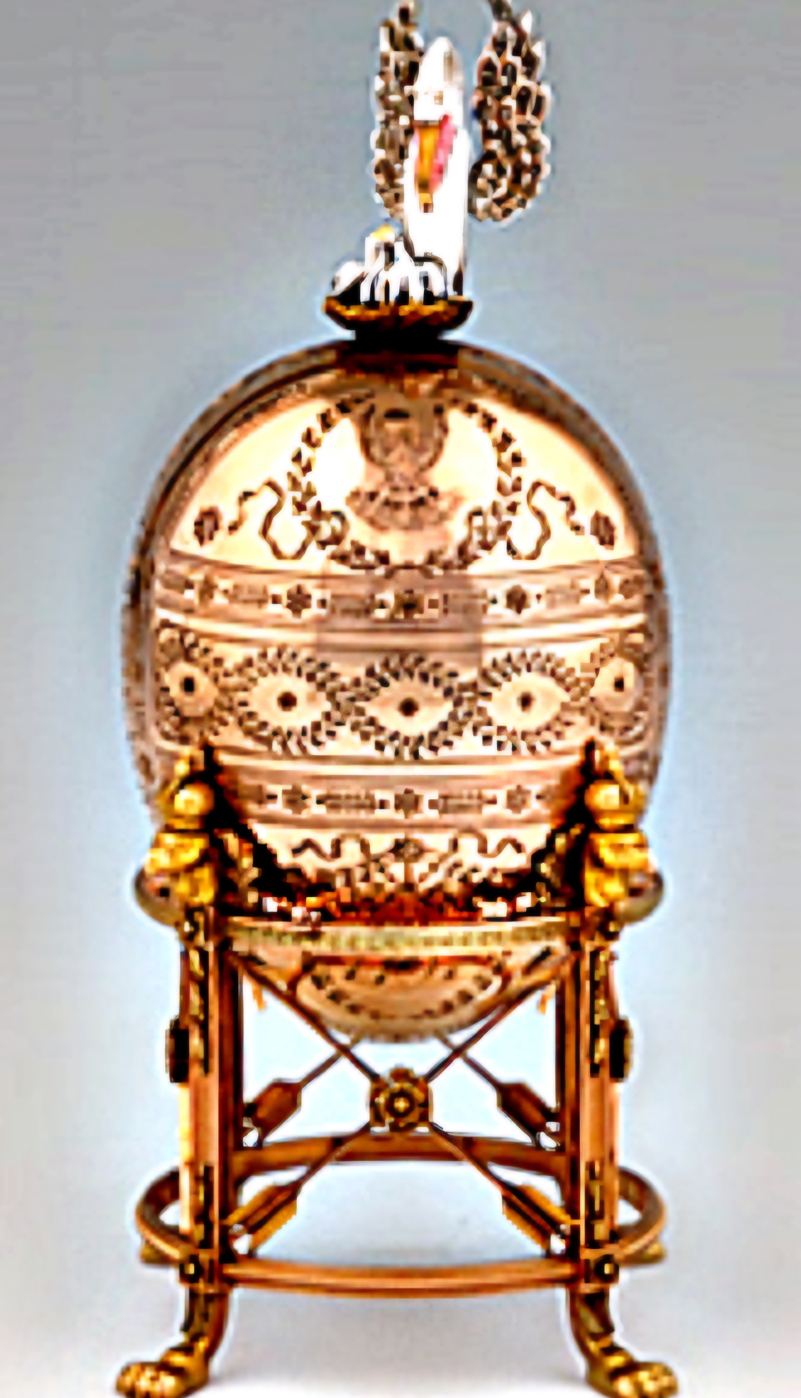 붉은 금, 다이아몬드, 진주, 회색이나 분홍빛, 푸른색, 유백색 에나멜로 만들어졌다. 달걀 받침대 자체는 다양한 샛색의 황금으로 주조했고 달걀을 열면 상아로 깎은 8면의 병풍이 펼쳐진다 파베르제의 황금 달걀 4편, 펠리컨