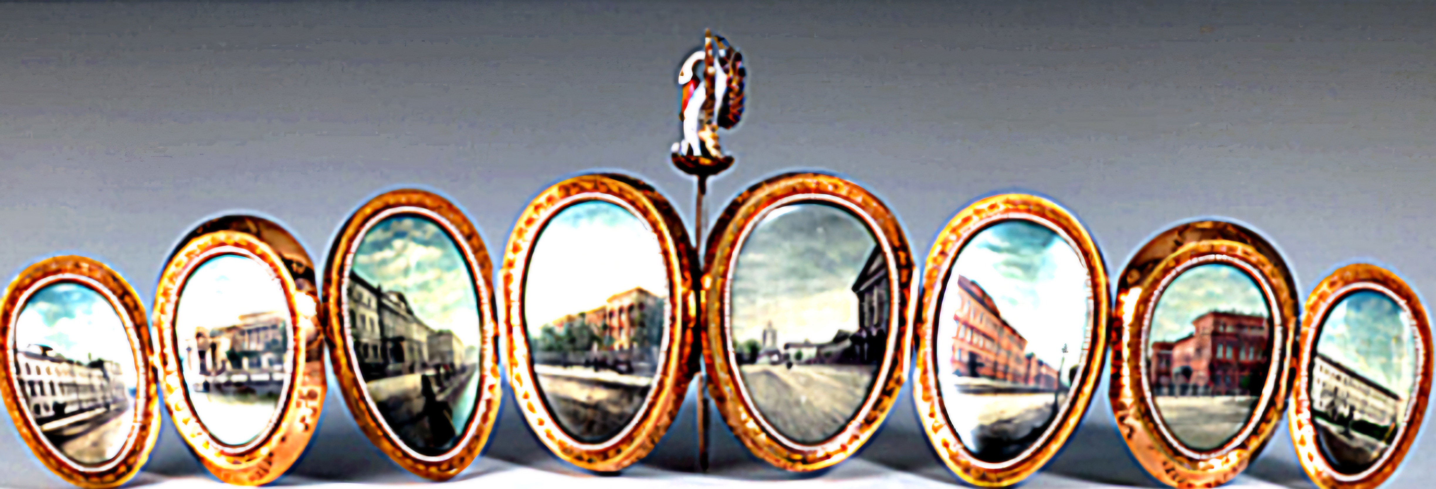크세닌스키 연구소, 니콜라이 고아원, 애국 연구소, 스몰니 연구소, 예카테리나 연구소, 파벨 연구소, 상트페테르부르크 니콜라이 고아원, 엘리자베스 연구소 등이 바로 그것. 이 기관들의 모습이 진주로 테두리를 친 상아 판넬 안에 그려져있다.