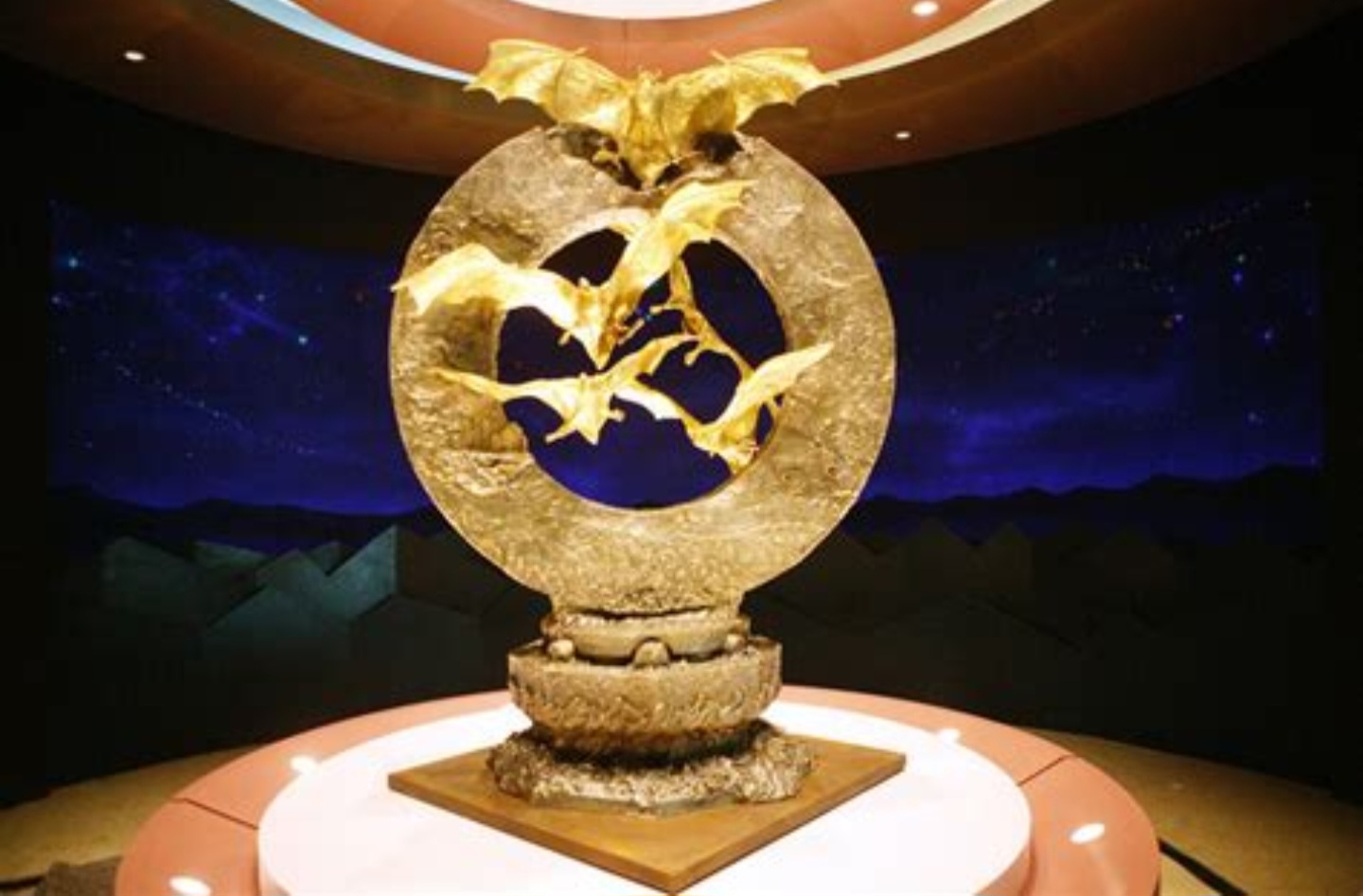 형태: 은으로 제작된 원형 구조물에 순금으로 만든 6마리의 박쥐가 날아오르는 모습을 형상화하였습니다.