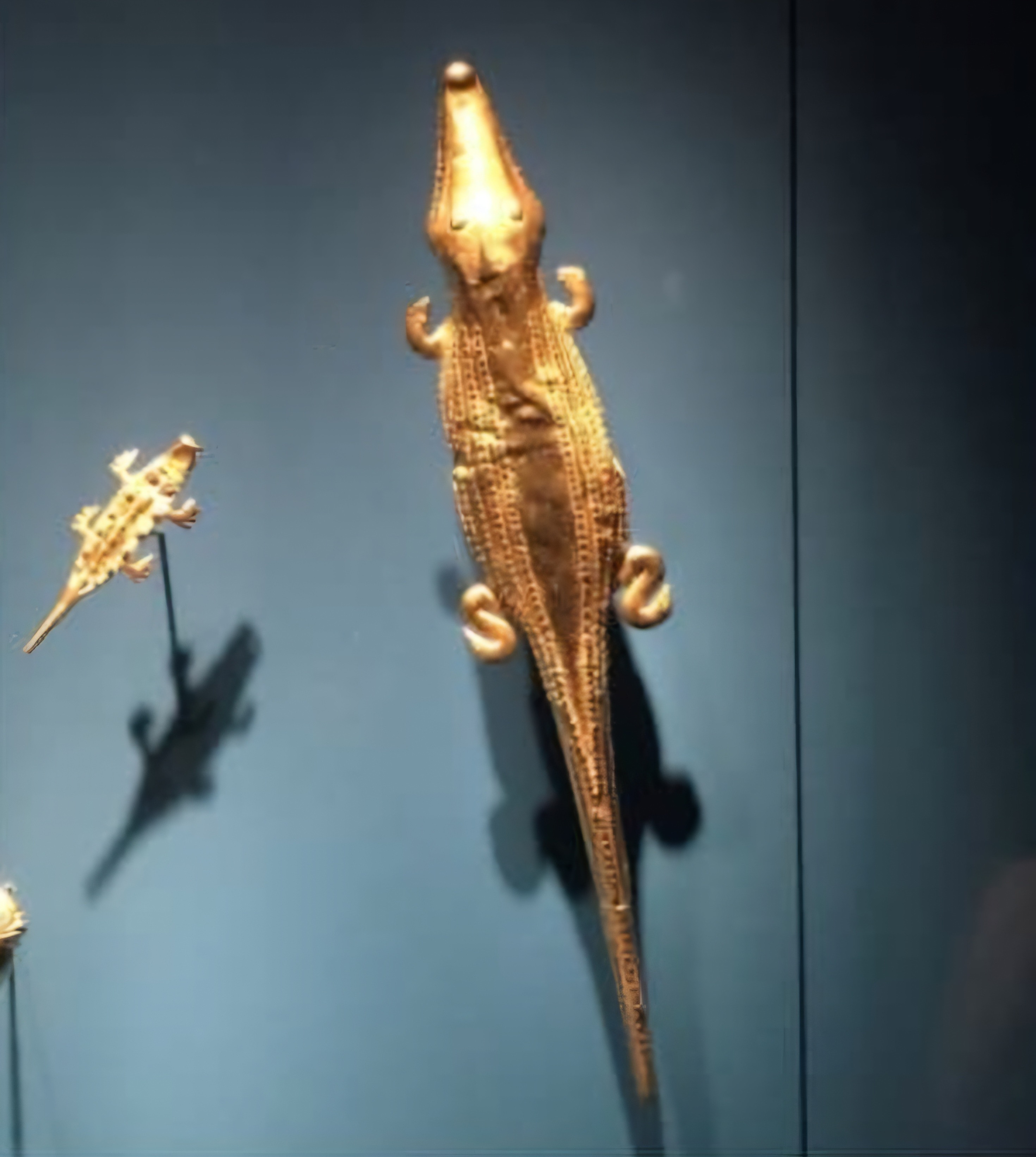 *황금 도마뱀 장식: 콜롬비아 원주민들이 자연과 동화된 삶을 표현한 유물로, 도마뱀 모양의 황금 장식은 생동감 넘치는 디자인으로 하늘과 땅을 연결하는 신성한 존재를 상징합니다.