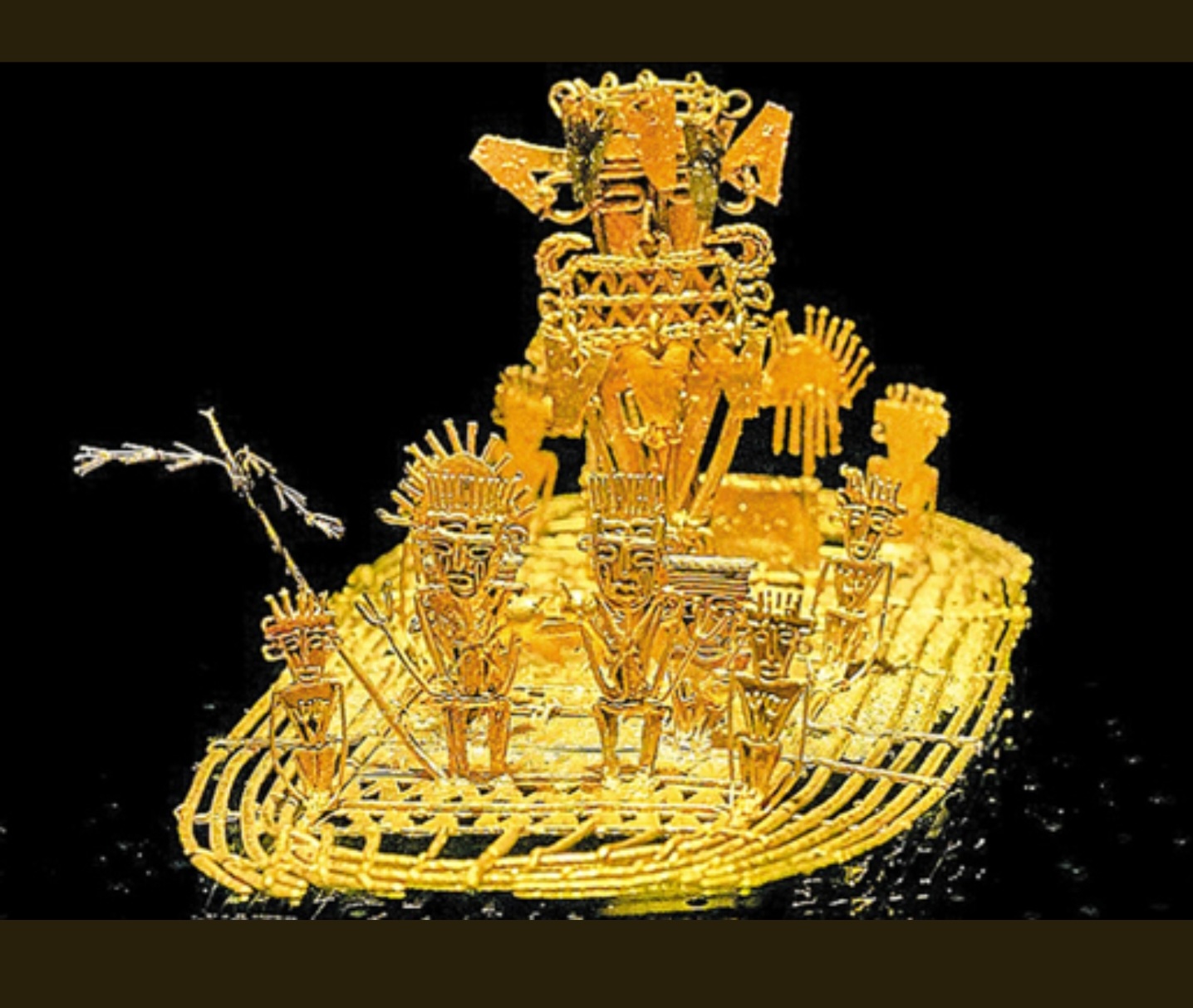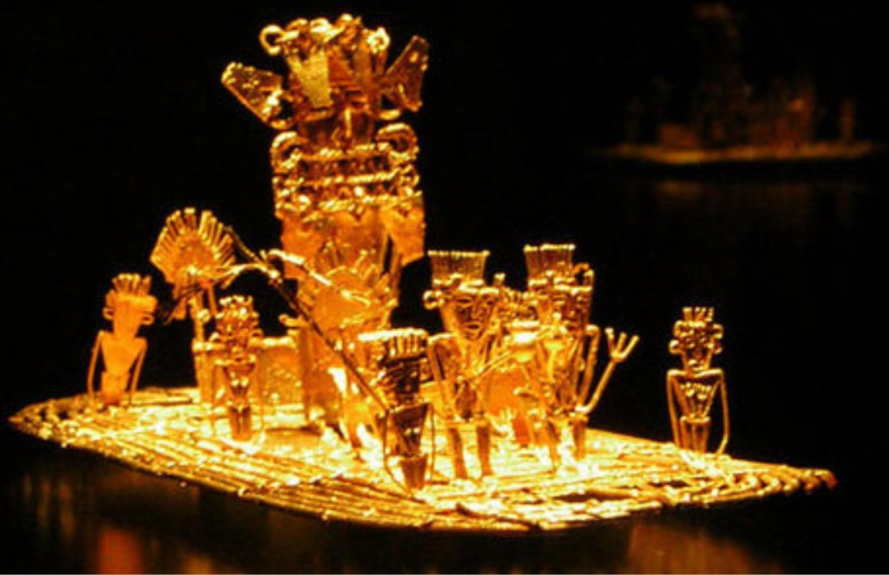 *무이스카 황금 뗏목: 콜롬비아에서 발견된 이 황금 조각은 무이스카 부족의 의식을 재현한 것으로, 엘도라도 전설의 기원을 보여줍니다. 족장이 금가루를 뒤집어쓰고 호수에 황금을 바치는 장면을 묘사합니다.